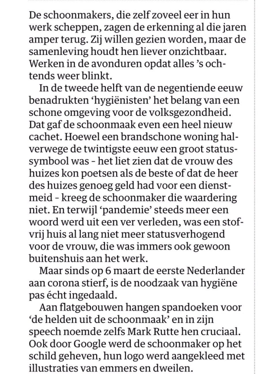 In de NRC van zaterdag 25 april staat een mooi artikel over schoonmakers in Brabant. Hoe emotioneel zwaar het ook kan zijn, de trots en het bezeg dat het noodzaak is, is erg mooi om te lezen. Daar is maar 1 woord voor: TROTS!